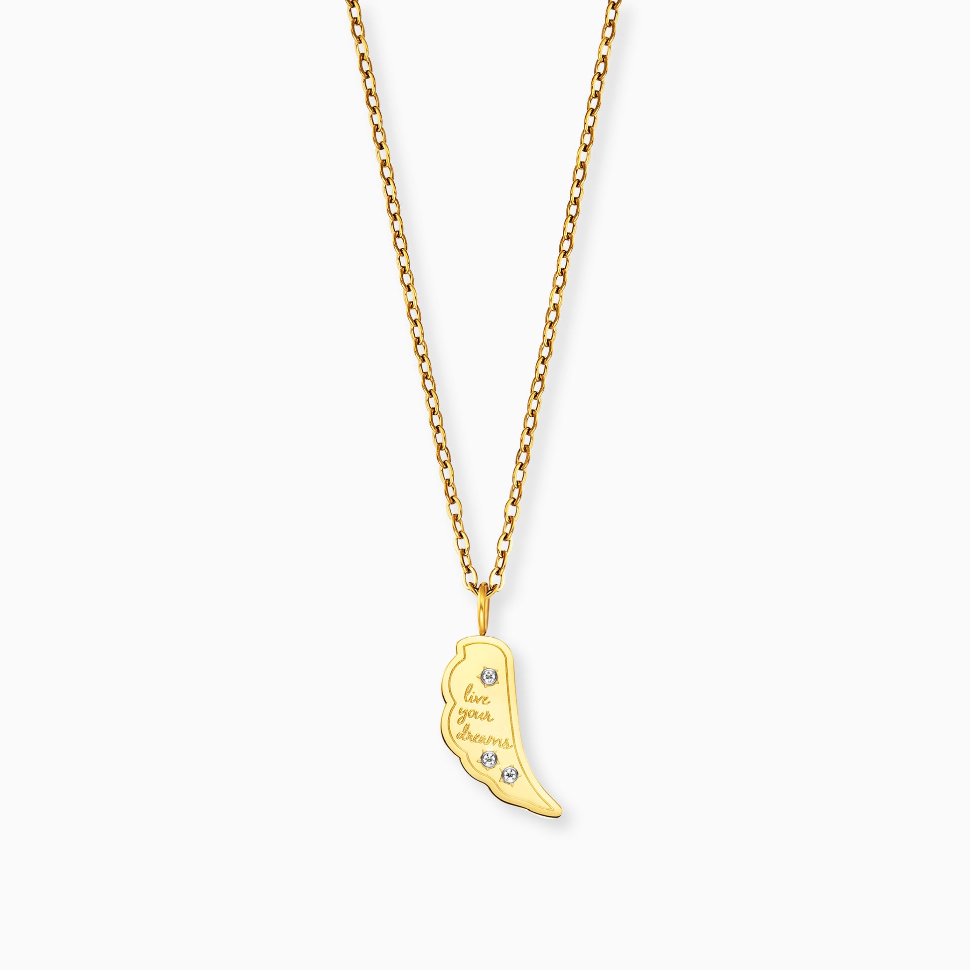 - Goldene Halskette mit graviertem Engelsflügel-Anhänger und 3 Zirkonia Stein